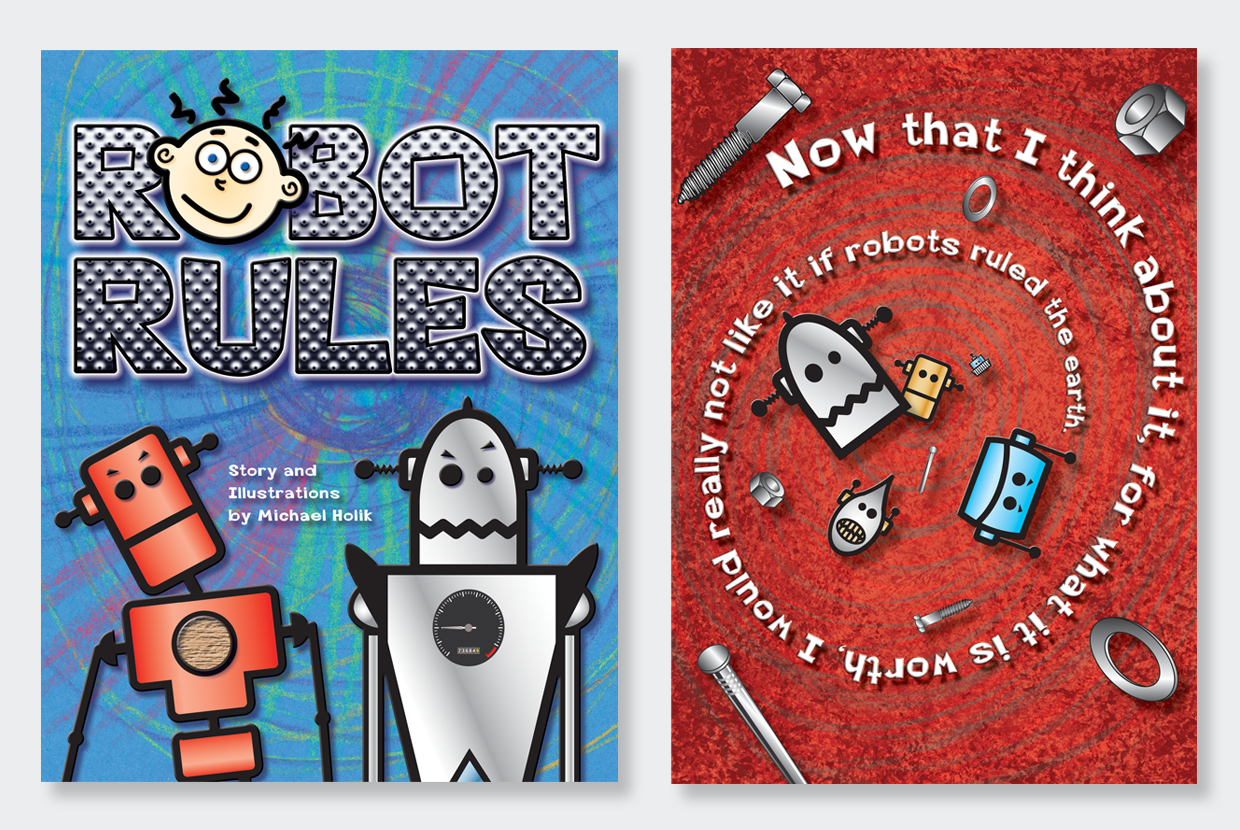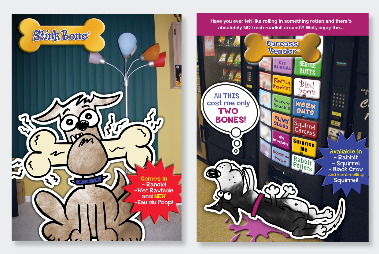 This is an in-progress children's picture book where I shot photographs around my home and office (which I used as backgrounds), illustrated the dogs and then inserted actual photo textures of dog hair in the outlines. (The dog on the left actually has my own dog's fur in it!) This is a book about fictional dog products.