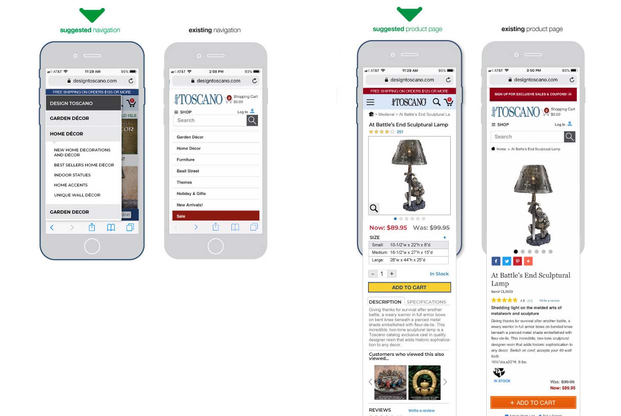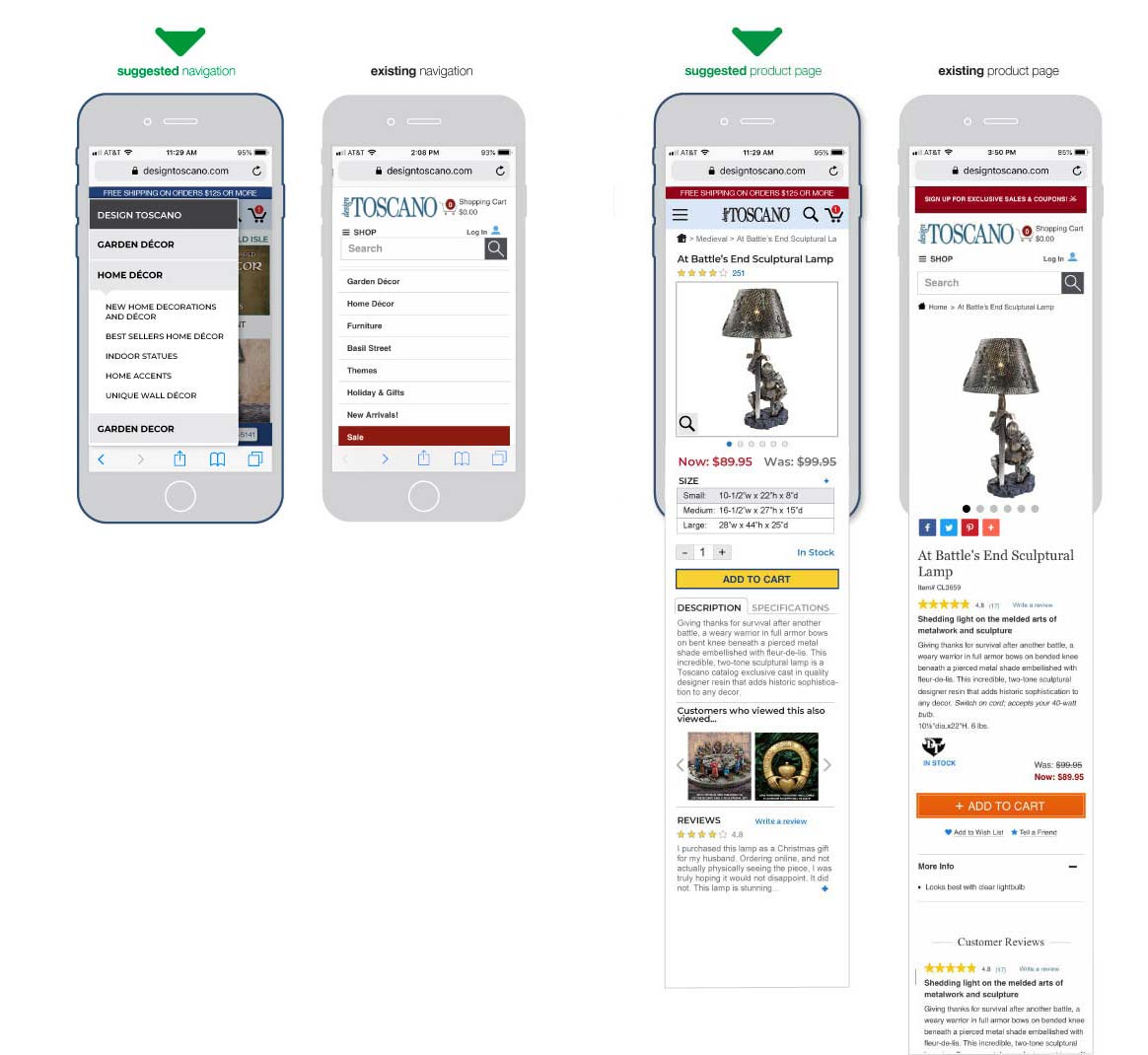 I am in the process of redesigning Design Toscano's mobile UI for the site. I am trying to make the interface easier for a customer to shop, more intuitive and improve on the placement of key information.